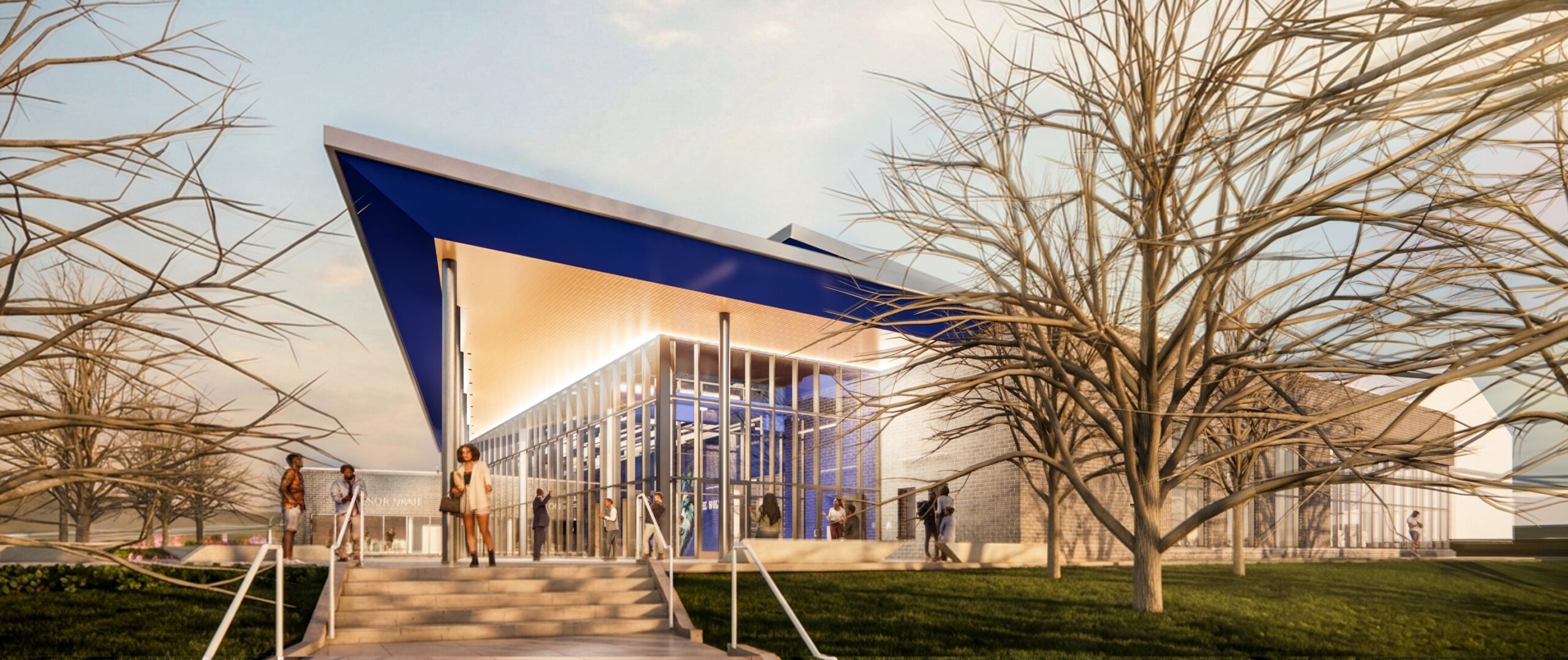 The project scope includes an indoor turf field, basketball and volleyball courts, a fitness center, food service, bathrooms, locker rooms, and storage. The exterior improvements include design and documentation of outdoor athletic fields, a new all-weather NCAA regulation track, a landscaped plaza, and pedestrian circulation network.