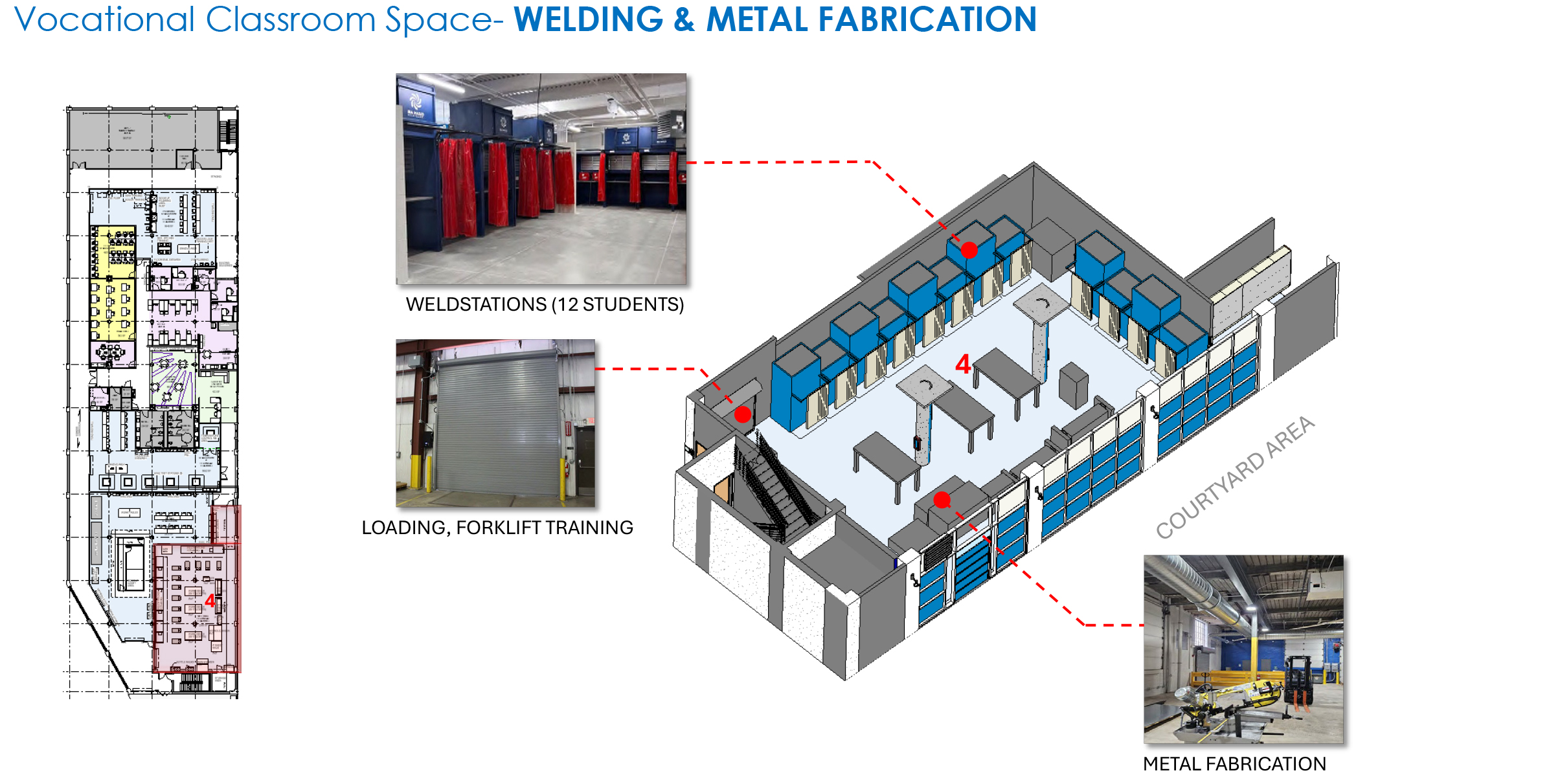 Tec Centro Esperanza includes separate instructional labs for Plumbing, HVAC, Maintenance & Repair, and Welding & Metal Fabrication. The Tec Centro Esperanza project is designed to be a hub of workforce development in Hunting Park. Dedicated corridors and integrated sound barriers ensure that multiple high-intensity classes, such as HVAC maintenance and facility repair, can operate simultaneously without disruption. This facility provides the essential tools and specialized environment required to prepare a highly skilled workforce for success in the 21st-century construction and maintenance industries.